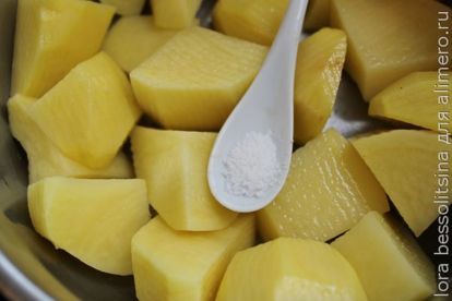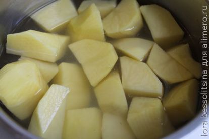 Затем зальем кипятком и отправим на газ. Должно получиться пюре, поэтому лучше картошку подбирать такого сорта, чтобы хорошо проваривалась. Сейчас, кстати, можно и духовку включить, чтобы до двухсот градусов нагрелась.