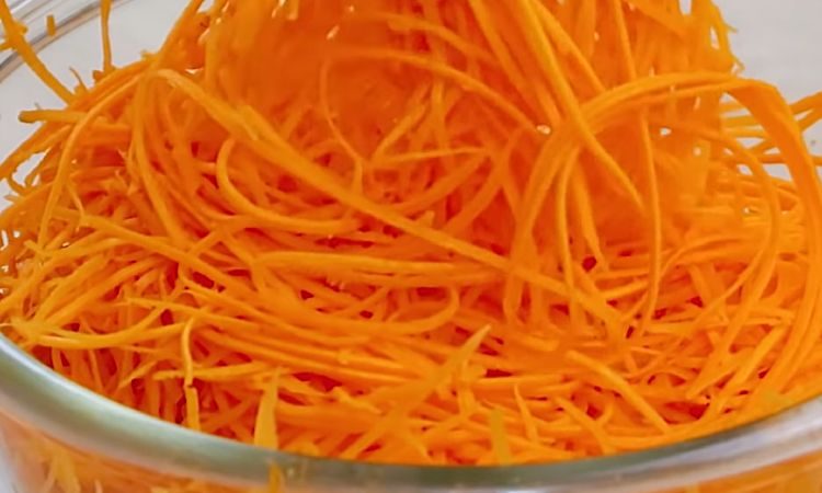 2. Натрите морковь на крупной терке. Если предпочитаете, можно использовать готовую морковь по-корейски для более насыщенного вкуса.