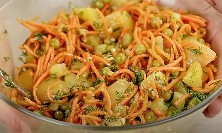 Обычно отваренный картофель служит простым гарниром, но сегодня мы предлагаем нечто другое. За 5-10 минут мы превратим его в насыщенный теплый салат, способный заменить не только гарнир, но и выступить в роли основного блюда. В этом рецепте мы добавим простые ингредиенты — морковь, немного зеленого горошка, чеснока и зелени.