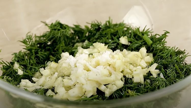 4. Приготовление зеленого соуса. Измельчите пару зубчиков чеснока. Нарежьте пучок укропа.