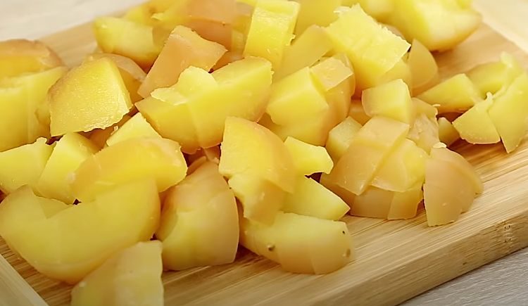 1. Варите картошку в подсоленной воде до готовности (примерно 20 минут после закипания). Отцедите, дайте картошке немного остыть, очистите от кожуры и нарежьте на кусочки размером чуть больше, чем для оливье.