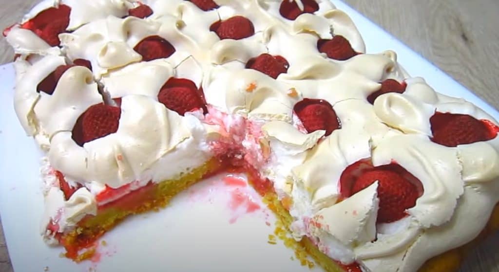 Готовим крем. Белки сбиваем минут 5, постепенно добавляем к ним сахар и сбиваем ещё 5 минут. На приготовленный корж распределяем сбытые белки ровным слоем. Сверху на крем выкладываем клубнику. Расстояние между ягодами должно быть около 3 см. Отправляем в духовку допекать пирог ещё на 20 минут.