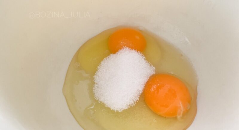 Берем глубокую миску и смешиваем в ней яйца (целиком), сахар и соль. Перемешиваем венчиком до однородности: