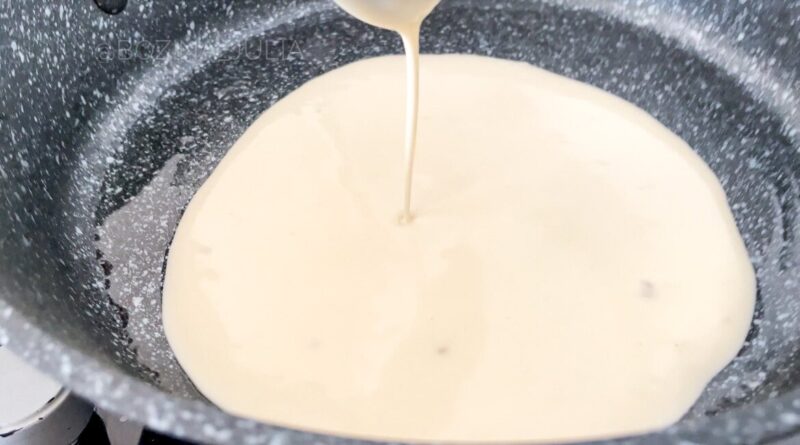 Тесто должно получиться жидким и очень хорошо стекать с ложки/венчика. Если видите, что тесто густое – добавьте еще немного молока. В самом конце влейте растопленное сливочное масло и хорошо перемешайте.