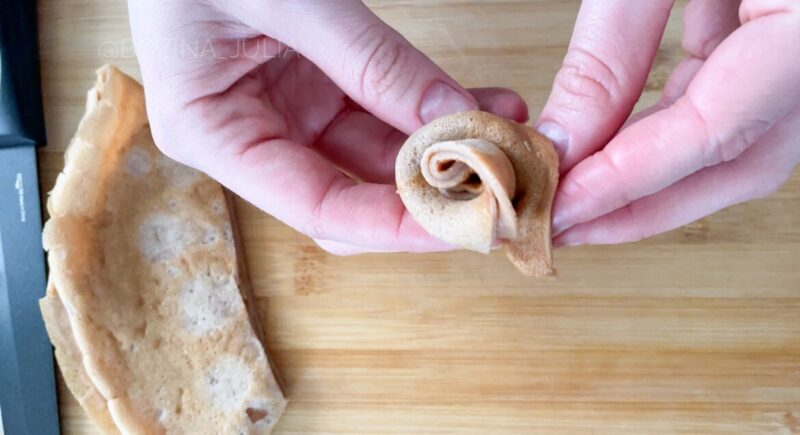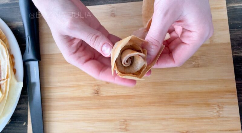 Скручиваем эту часть в форме розочки, слегка разгибая края блина наружу: