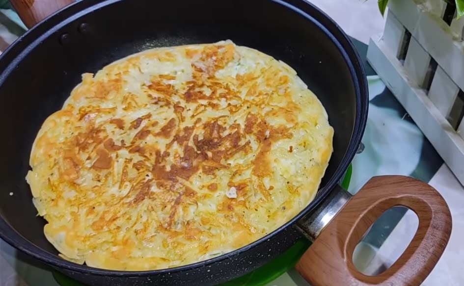 После этого влейте на сковороду половину приготовленного теста, чтобы оно покрыло картофель. Встряхните сковороду, чтобы масса распределилась равномерно и заполнила все промежутки между картофелем. Жарьте с одной стороны на слабом огне. Когда образуется корочка, переверните на другой и жарьте до полной готовности.