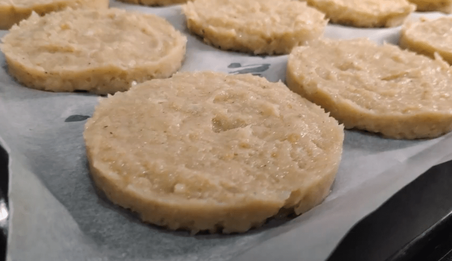 Противень застилаем бумагой для выпечки. С помощью кулинарного кольца формируем из фарша плоские котлеты.