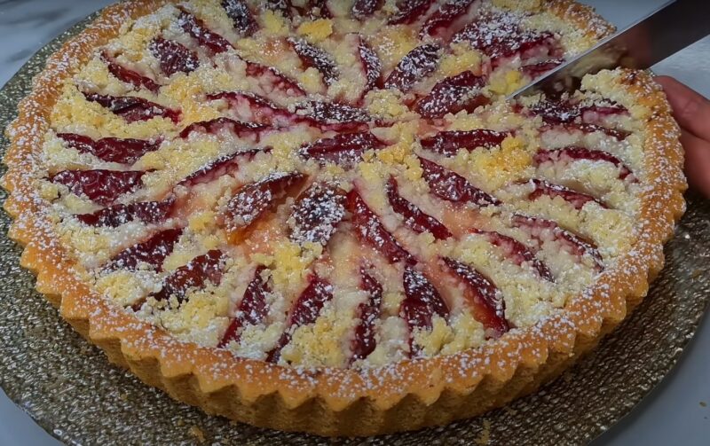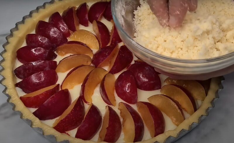 Кладем на кремовый слой по кругу дольки слив, заполняем также внутреннюю часть круга. Для посыпки соединяем муку с сахаром, а затем добавляем сливочное масло и перетираем компоненты в крошку.