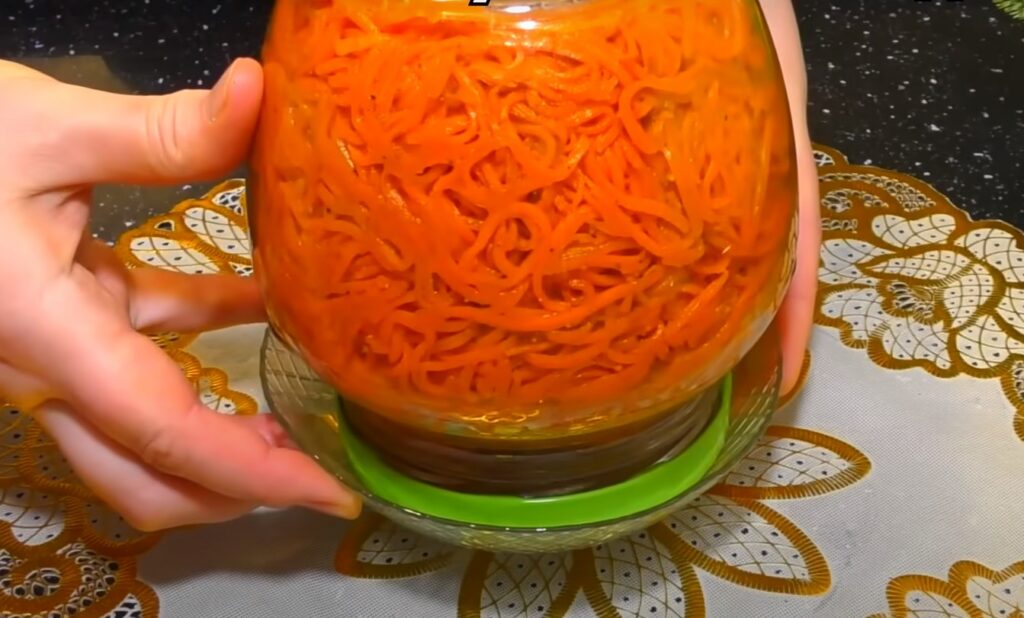 Закрываем банку крышкой и переворачиваем дном вверх. Убираем морковь в холодильник на 24 часа.