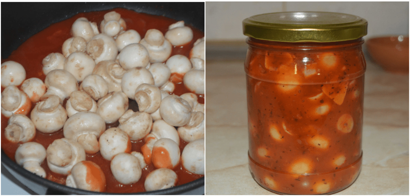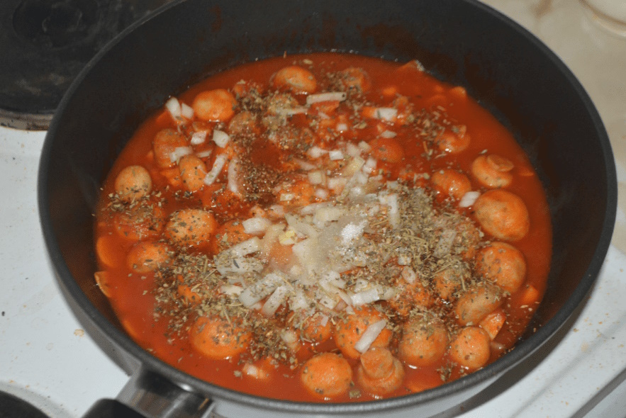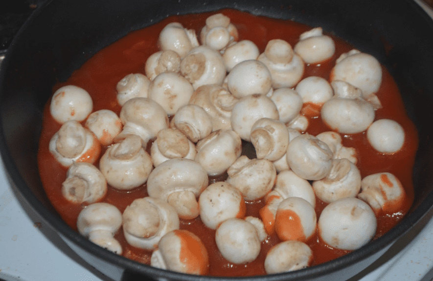 Чеснок обжарился, добавляем томат, у меня примерно 200 гр. прогреваем 1-2 минуты и добавляем грибы. Закрываем крышкой и оставляем на 15-20 минут. На фото видно, что томата совсем немного и грибы не покрывает, но в процессе приготовления грибы отдадут влагу, и упадут в размере, так что все гудит.