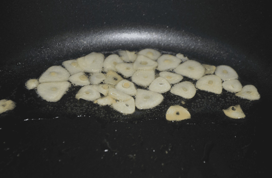 Ставим сковороду на средний нагрев, добавляем немного подсолнечного масла, обжариваем чеснок, очень аккуратно и внимательно, он должен лишь немного покоричневеть, если почернеет – начинайте заново!
