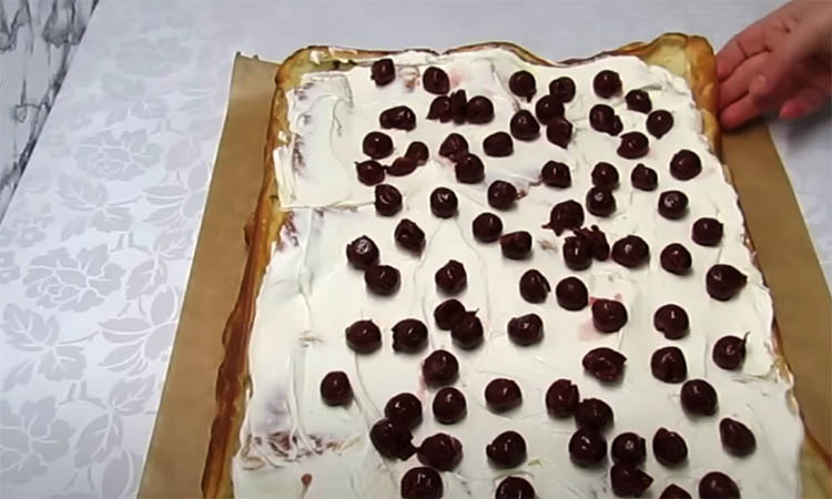 Выложите крем на остывшую основу рулета и равномерно распределите. Положите ягоды на крем.