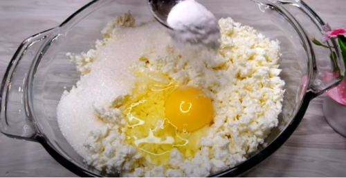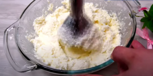 Творог положите в глубокую посуду. Лучше всего подойдет фермерский творог, поскольку он должен быть высоко качества и жирный.