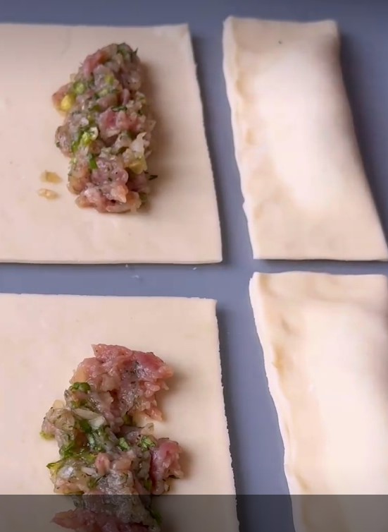 В квадратики кладем начинку — по столовой ложке. Запечатываем края теста, скрываем внутри начинку.