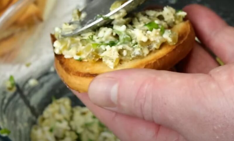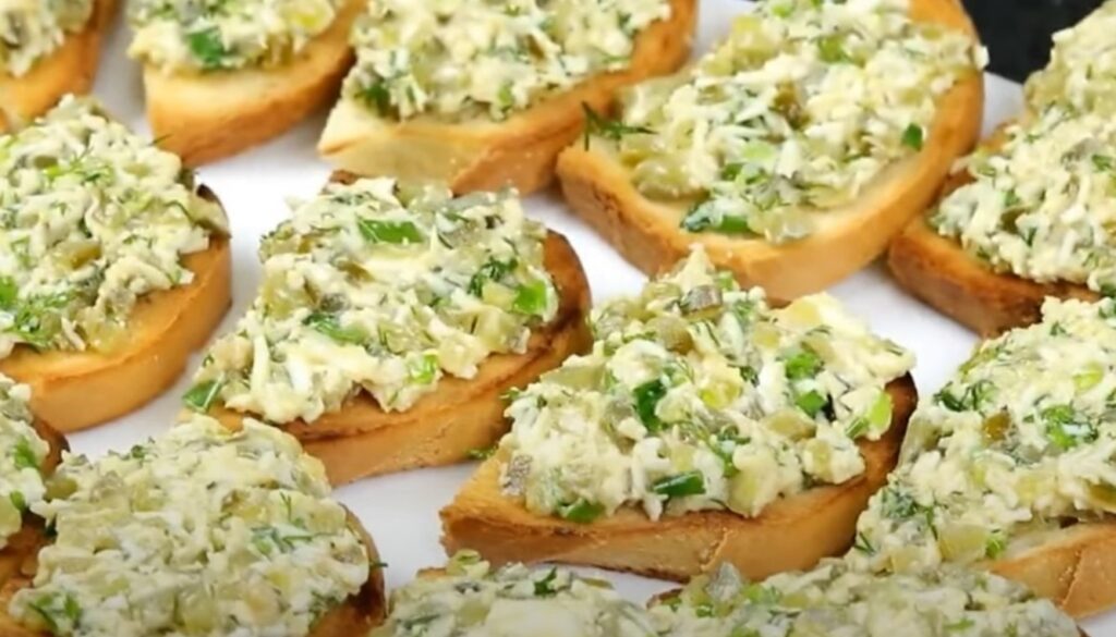 Смазываем ломтики хлеба закуской из соленых огурцов.