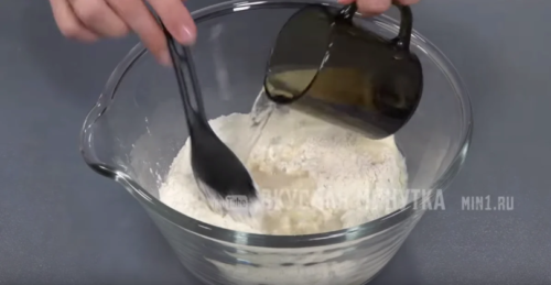Сначала вымешиваем тесто с помощью ложки. Как вода станет приемлемой температуры, то продолжаем вымешивать руками.