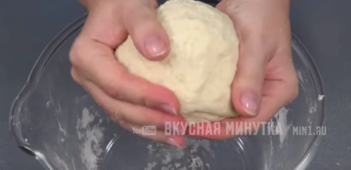 Затем обминаем тесто на доске или рабочей поверхности. Муку не подсыпаем, вот поэтому рецепт очень практичен.