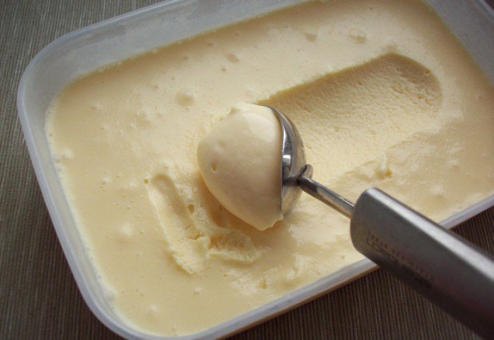 Банка сгущенки 380 г (если хотите крем-брюле берёте вареную) и 500 мл самых жирных сливок. ВСЁ!!! А, ну еще ванилька… Мороженое идеальной консистенции, без снега, льда, пузырей, крупинок и прочего инея.