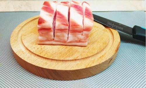 Подойдет сало и с мясной прослойкой. Помойте его под холодной водой и срежьте толстую шкурку.