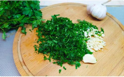 Меленько порубите зелень и измельчите чеснок тоже ножом. Смешайте их и всыпьте пол ч. л. соли, чтобы они выделили сок.