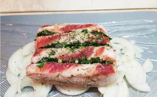 На рабочей поверхности разверните пленку и положите на нее репчатый лук порезанный в виде полуколец, а на него сало.