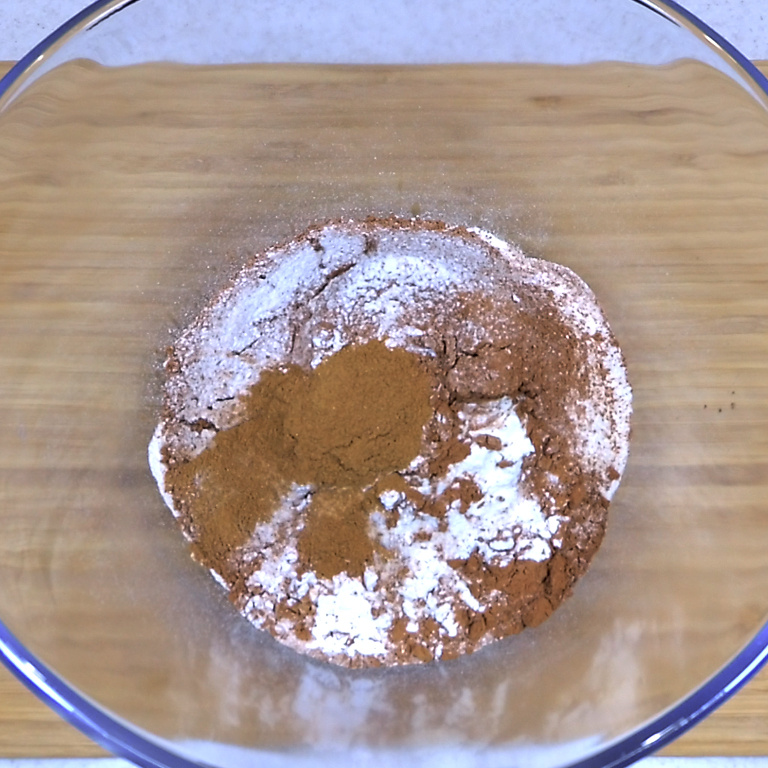 Начинаем готовить. Берем удобную ёмкость, в которой будем замешивать тесто. Всыпаем в неё все сухие ингредиенты, кроме сахара. С ним будет отдельная история. Итак, сначала у нас идут мука, какао, разрыхлитель и корица. Муку и какао просеиваем через сито. Пока ничего не перемешиваем.