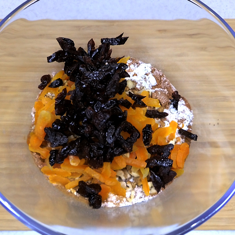 Далее берем сухофрукты. Можно любые. У меня в рецепте чернослив и курага. Режем их тонкими полосочками или небольшими кусочками.