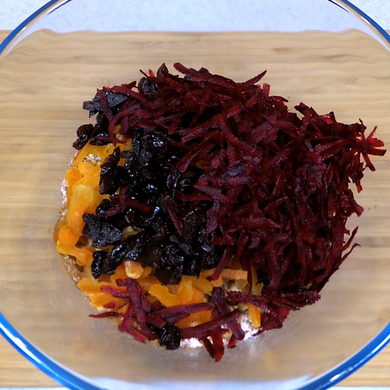 Орехи с сухофруктами отправляем в миску с сухими ингредиентами. И затем берем тот самый продукт, ради которого все и затеялось. Это, друзья, свекла. Тот самый удивительный ингредиент. Свекла идет в рецепт сырая, что еще более удивительно.