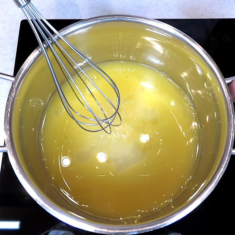 Что делаем далее. Переходим к жидкой составляющей теста. Ставим на плиту кастрюльку и вливаем в неё апельсиновый сок. Можно его отжать самостоятельно, можно взять магазинный из пакетика.