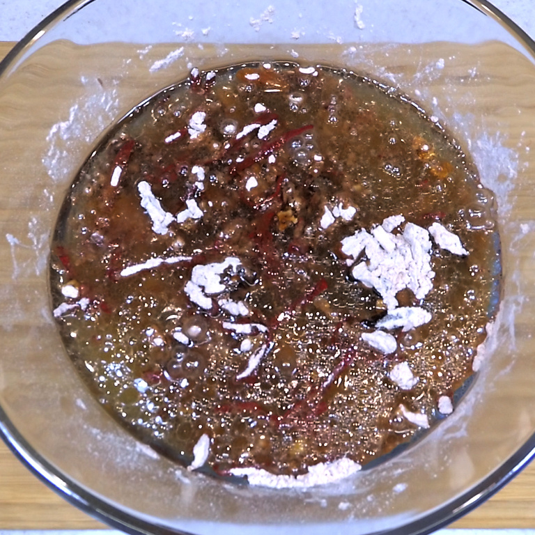 И как только она остынет вливаем в сухие ингредиенты с сухофруктами и сырой свеклой. Перемешиваем до растворения комочков. Это наше тесто. Оно не густое и не жидкое.