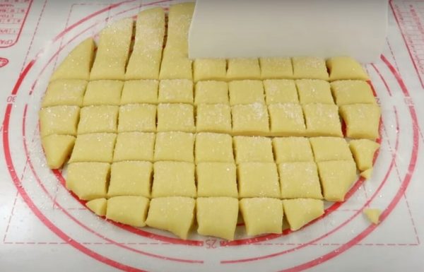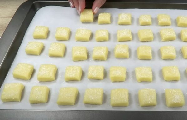 Готовится просто. Сперва смешивают все жидкие компоненты, затем туда же песок. Как растворился, половину муки с разрыхлителем. А затем месим колобок, подсыпая оставшуюся муку, раскатываем на коврике для выпечки, режем и посыпаем сахарком.