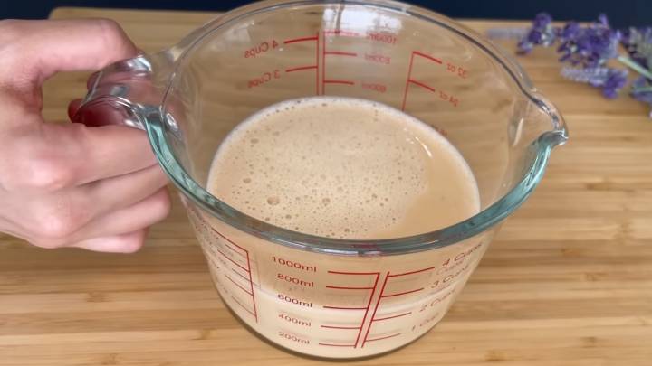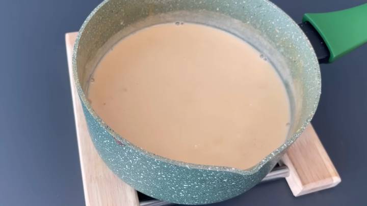 Затем влейте всё горячее молоко. Доведите до начала кипения, выключите. Молоко будет приятного оттенка крем-брюле.