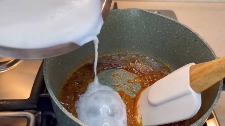 Параллельно в сотейник с антипригарным дном высыпьте сахар. На среднем огне доведите до карамели, не помешивая лопаткой. Потихоньку влейте в готовую жидкую карамель молоко. Сначала добавьте совсем немного, перемешайте.