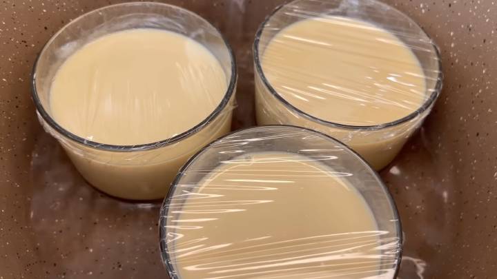Разлейте по креманкам или стаканам. Накройте пищевой плёнкой. Переложите в кастрюлю с толстым дном. Залейте горячей водой так, чтобы она не покрывала стаканы. Поставьте на плиту. Накройте крышкой и варите 15 минут на среднем огне.
