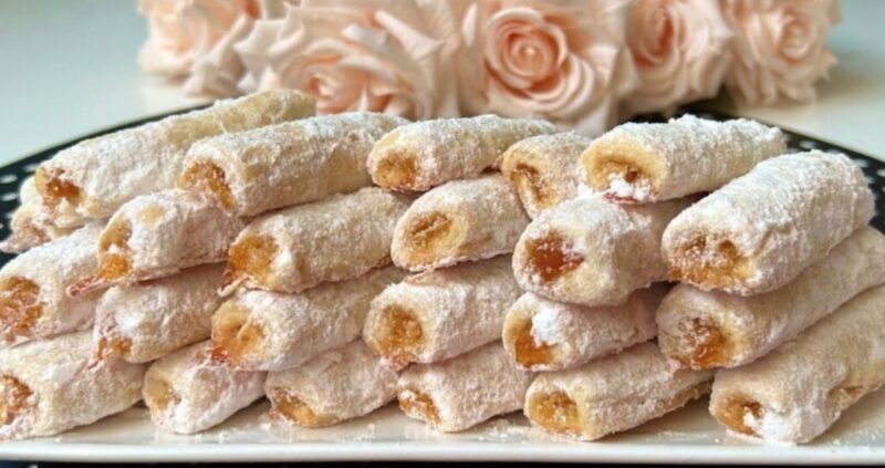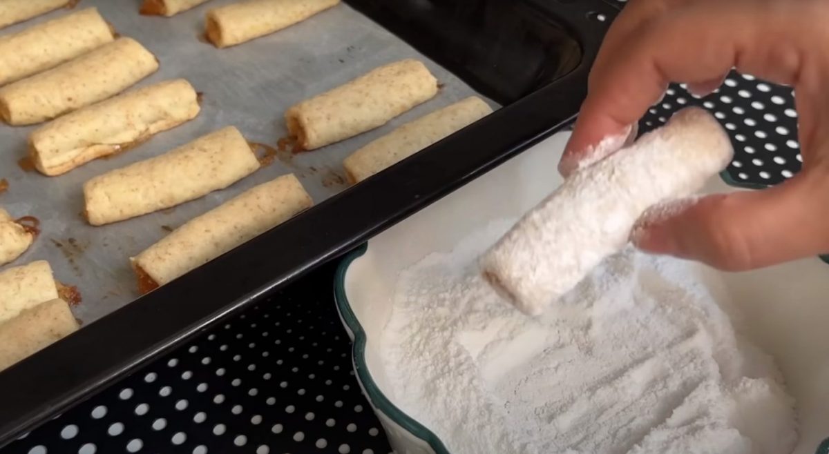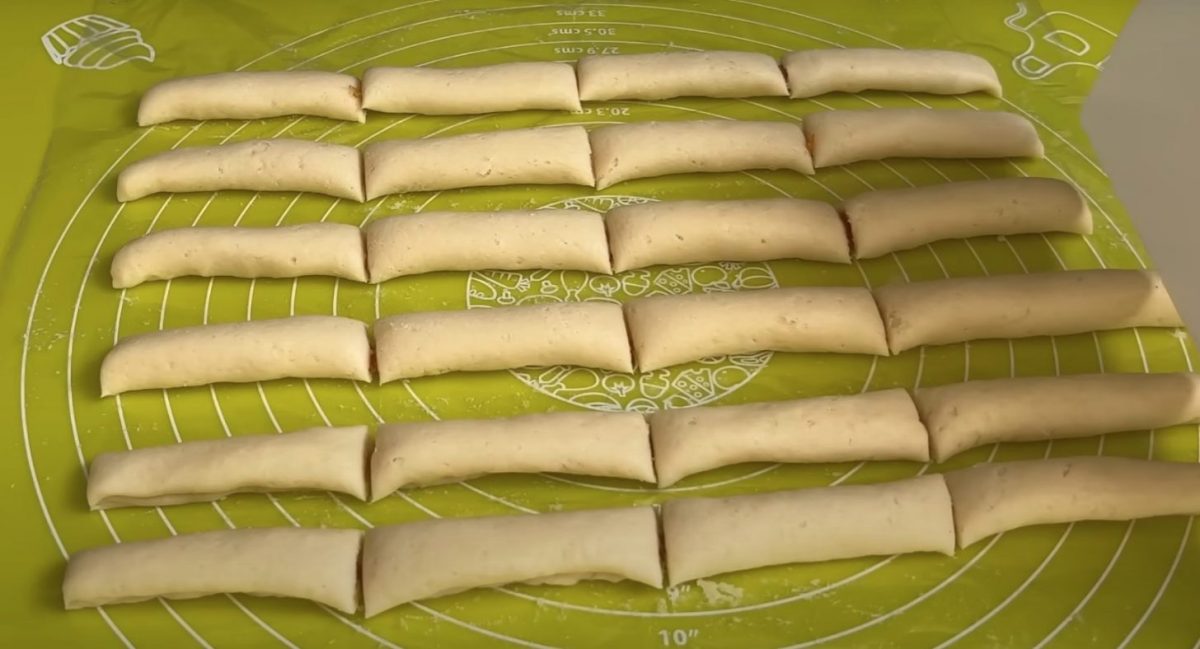 Закройте тесто и защипните края, чтобы начинка оказалась внутри. Нарежьте получившиеся рулетики на небольшие трубочки и выложите их на пергамент, уложенный на противне.