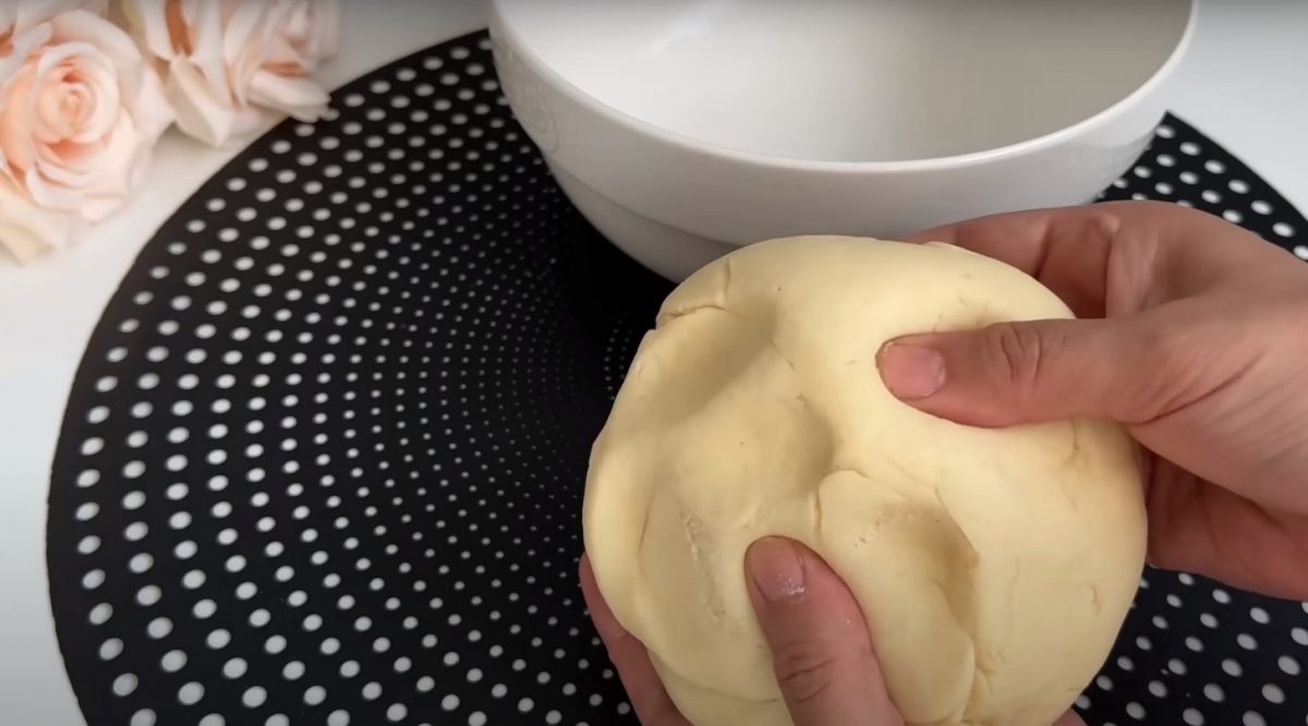 Добавьте в крошку греческий йогурт и замесите эластичное и нелипкое тесто, сначала смешивая лопаткой, а затем руками.