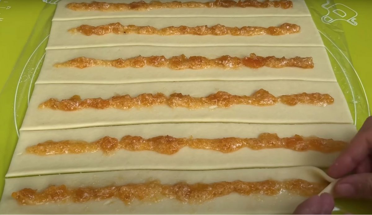 Смешайте варенье с кокосовой стружкой и выложите полоску начинки вдоль каждой полоски теста.
