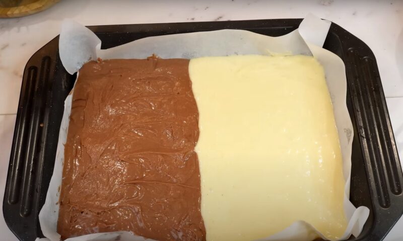 Застилаем противень пергаментом, на одну часть выкладываем какао тесто, а на вторую обычное.
