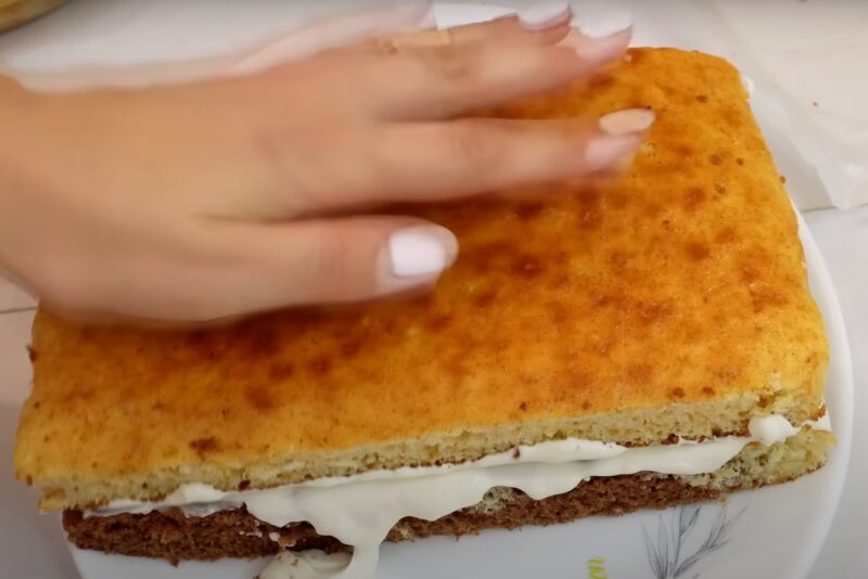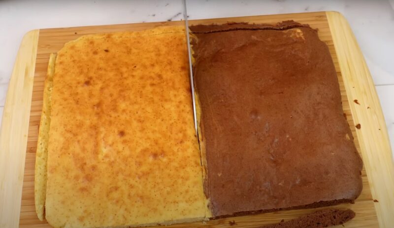 Для начинки смешиваем сметану с сахарной пудрой, взбиваем венчиком. Края бисквита подравниваем ножом, делим бисквит на светлый и темный.