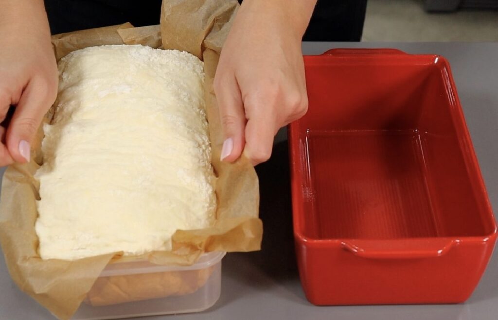 Я буду печь хлеб в прямоугольной форме, поэтому придаю хлебу такую же форму. Можно выпекать и в круглой форме или кастрюле, тогда тесто соберите в узелок и округлите.