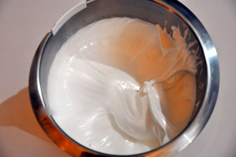 2. Взбейте белки вместе с солью и лимонной кислотой (можно выжать пару капель лимонного сока), постепенно добавляя сахар.