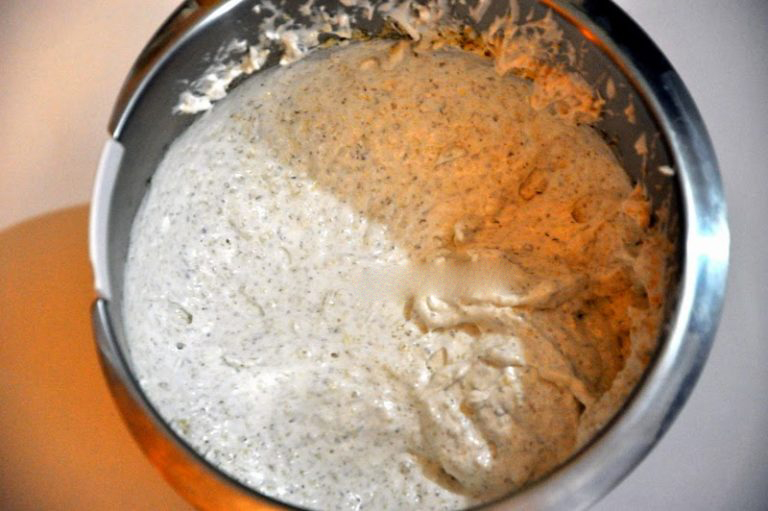 3. Всыпьте в смесь муку и измельчённые орехи, тщательно перемешайте.