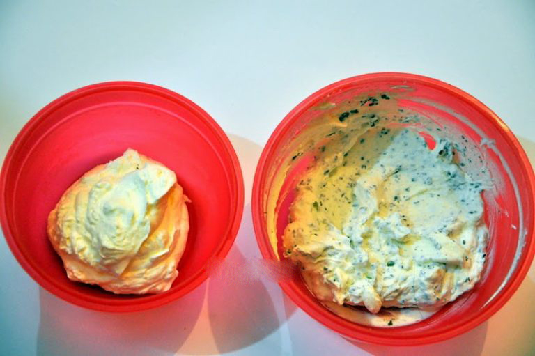 7. Чтобы приготовить крем, взбейте сливки вместе с сахарной пудрой. Отложите 4 ст.л. жирных сливок в отдельную ёмкость, добавьте туда тёртый шоколад (30 г.) и тщательно перемешайте.