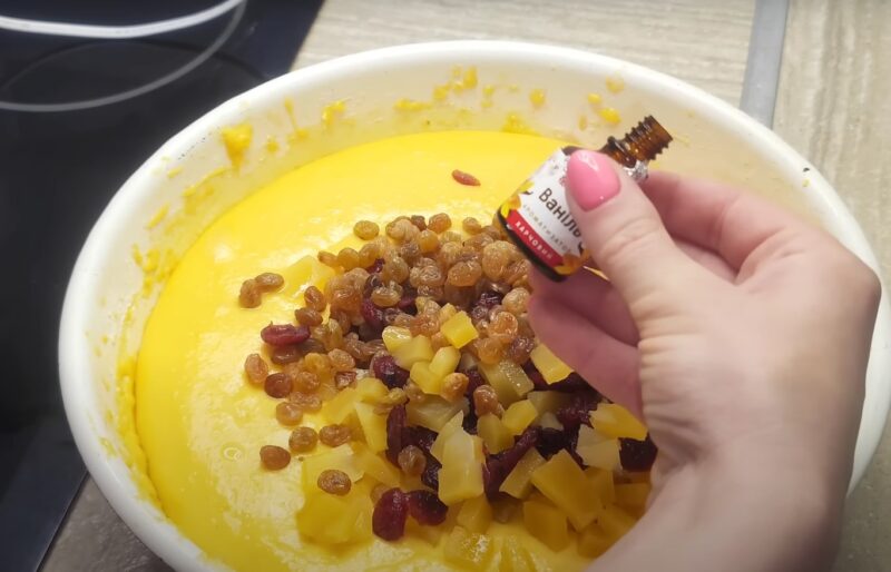 Сливаем лишнюю жидкость с цукатов, добавляем их в тесто. Добавляем ванильную эссенцию и взбиваем тесто 10 минут.