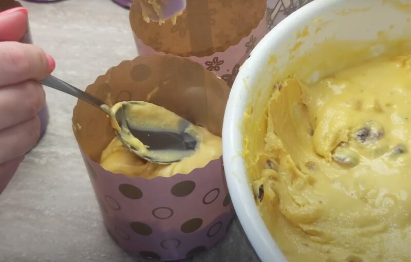 Выкладываем тесто в формы для куличей на ⅓.