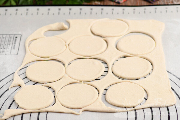 1. Для приготовления беру дрожжевое слоеное тесто (можно заменить и на бездрожжевое). В пачке 2 пласта. Раскатываем пласты теста не очень тонко и вырезаем кружочки (диаметр 7 см). Остатки теста округляем и снова раскатываем.