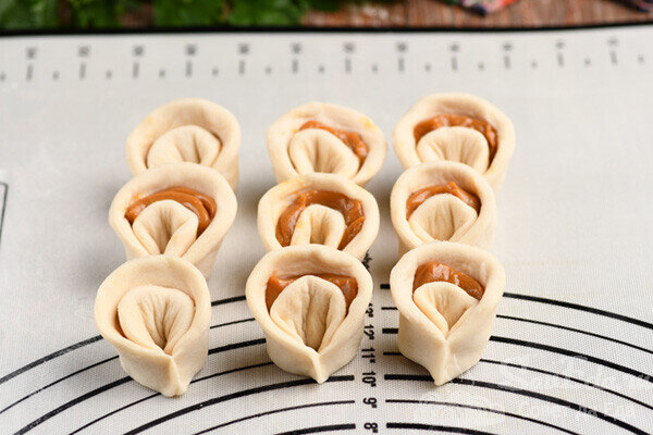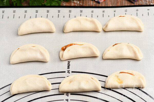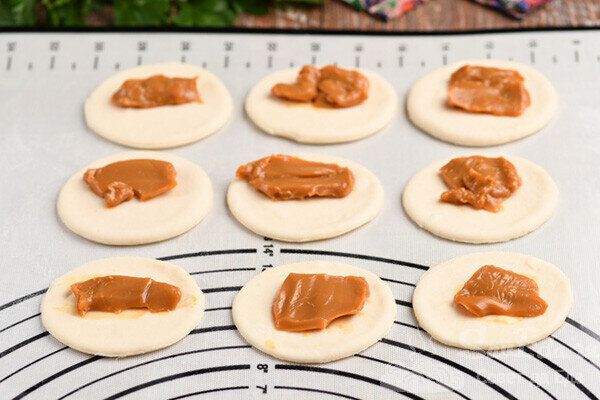 2. На тесто ближе к одному краю выкладываем небольшое количество вареной сгущенки. Из каждого пласта теста получается 17-19 кружочков.
