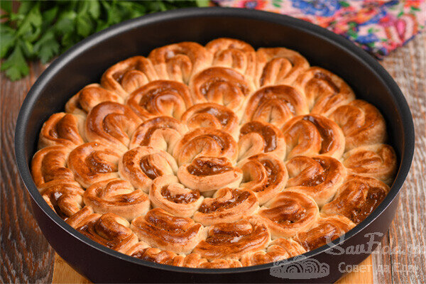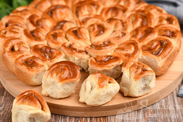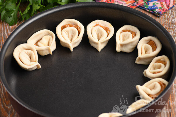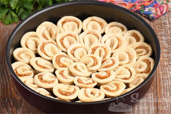 5. Заготовки из теста и сгущенки размещаем по кругу в форме (диаметр 24 см).