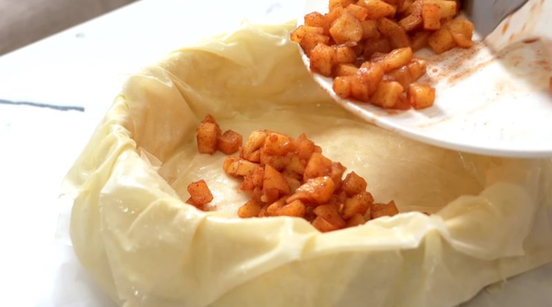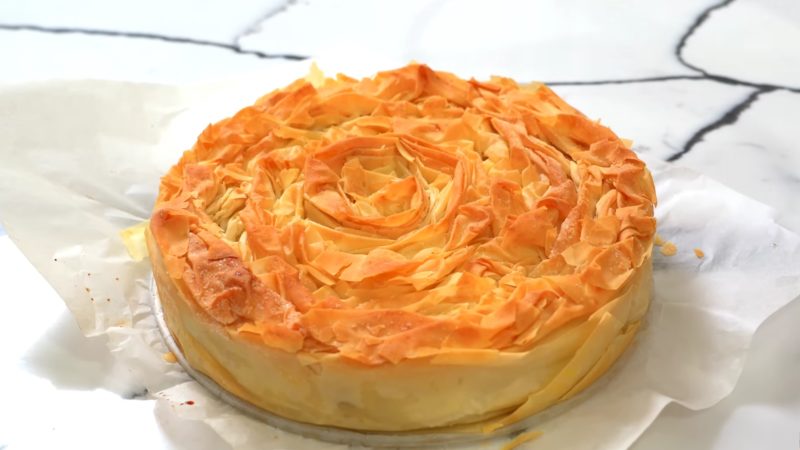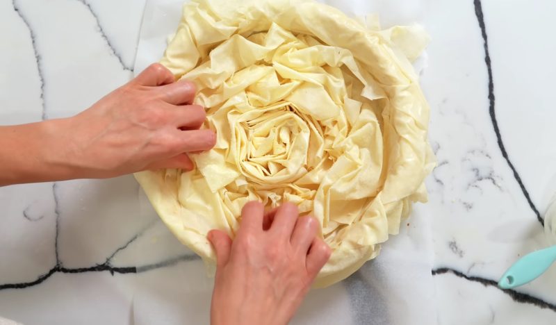 Накройте начинку оставшимися листами теста фило (кроме одного). Последний лист сложите гармошкой и сформуйте из него розочку. Выложите розочку на центр пирога. Свободные края теста разложите внутри формы.
