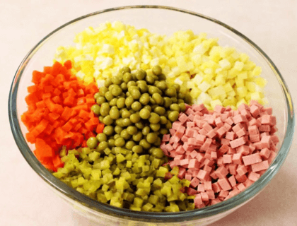Второй секрет – отваривание овощей. Их желательно варить заранее, минимум за день до даты приготовления «Оливье». В таком случае овощи обретут нужную плотность и не будут разваливаться во время нарезания.